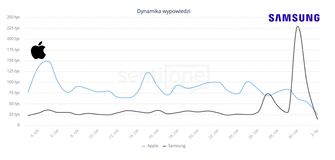 Mentions in time, Apple vs Samsung. Source: SentiOne