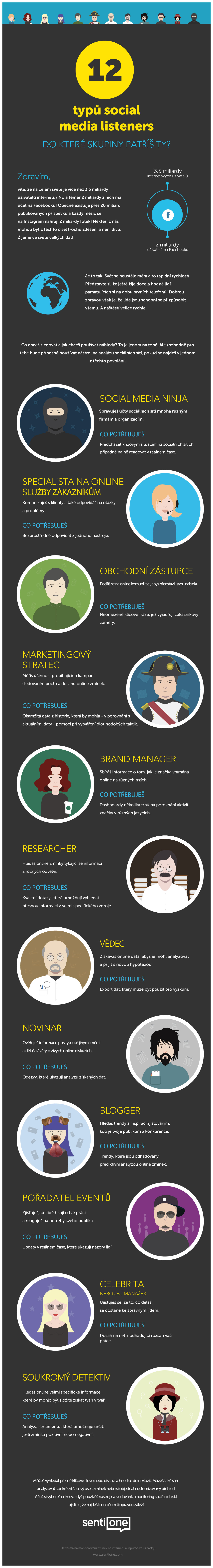 Představujeme vám 12 typů social media listeners a prozradíme, jak může být SentiOne nápomocen každému z nich.