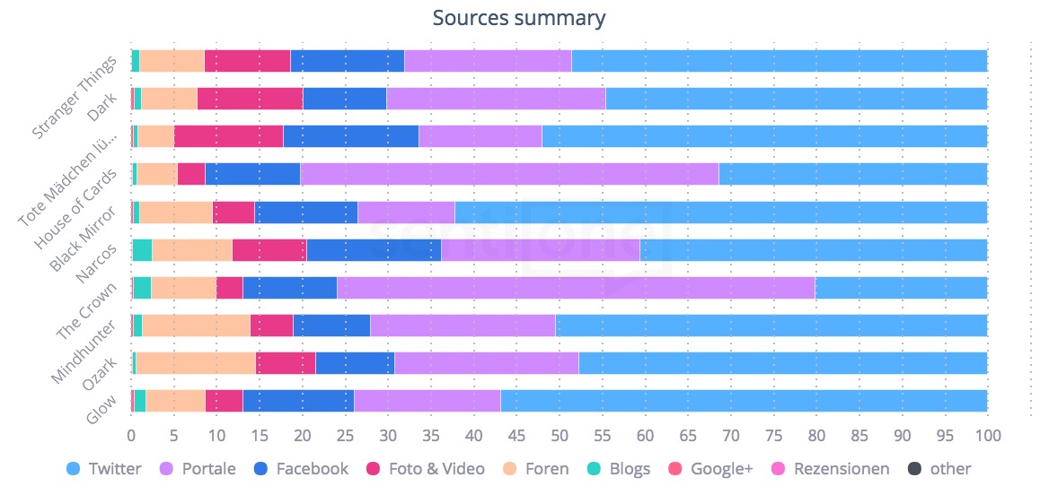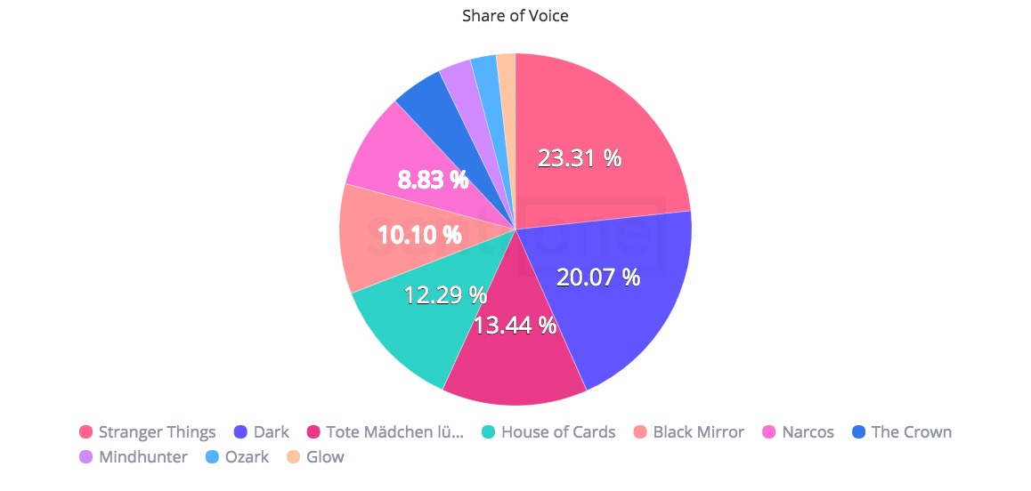SentiOne hat sich einmal die beliebtesten Netflix-Serien 2017 (Ozark, Narcos, House of Cards, Stranger Things, Glow, Tote Mädchen lügen nicht, The Crown, Mindhunter, Black Mirror und Dark) vorgenommen und analysiert, wie in den sozialen Medien und darüber hinaus in Blogs, Foren und auf News-Seiten gesprochen wurde.
