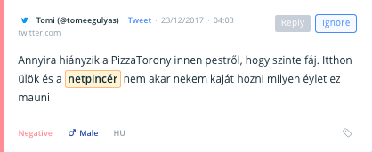 Ha hétfő, akkor például Netpincér. Lehet, azt gondolnánk: hétvégén van rá a legnagyobb szükségünk, ugyanakkor az ezzel kapcsolatos webes kommunikációs dömping bizony hétfőn landol az interneten. Vajon azért, mert hétvégén mi magunk főzünk otthon? Vagy mert pont, hogy nem főzünk, és nincs mit ennünk a hétfői ebédszünetben? Az eredmények mögötti konkrét miértek persze kideríthetők a SentiOne-ból.