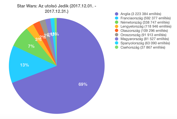 Európát is. A social listeningen keresztül azt is megnéztük, hogy melyik országnál izzott igazán a Star Wars téma online 2017. december 1. és 31. között. Illetve, hogy kik szerették a leginkább és a legkevésbé a nyolcadik részt. Az európai trend-check annó már a Twin Peaks második évadánál is szuper érdekes eredményeket hozott.
