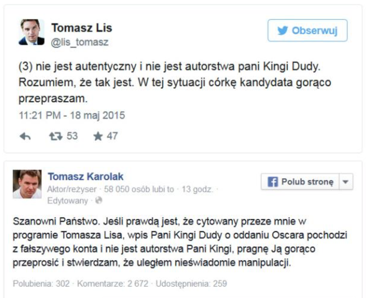 Poniżej przykład sytuacji, która miała miejsce w 2015 roku. Tomasz Lis przygotowując się do programu telewizyjnego nie zweryfikował źródła i wykorzystał dane opublikowane na fałszywym profilu osoby podszywającej się pod córkę kandydata na prezydenta.