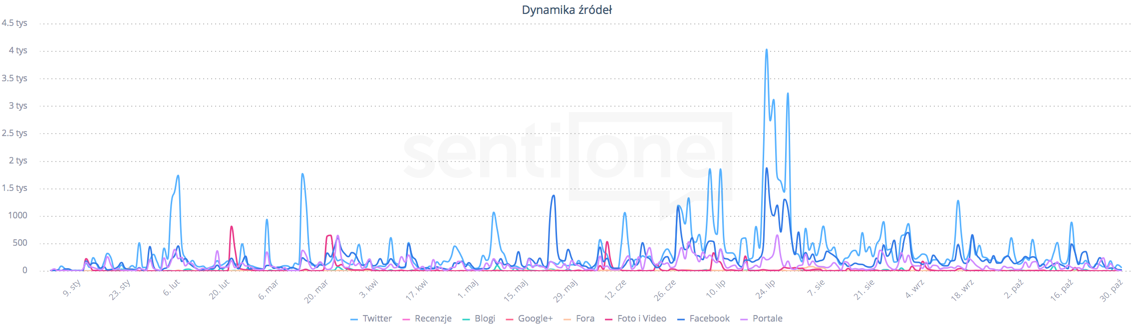 Dynamika wzmianek na temat “Fake news” w podziale na źródła. Źródło: SentiOne