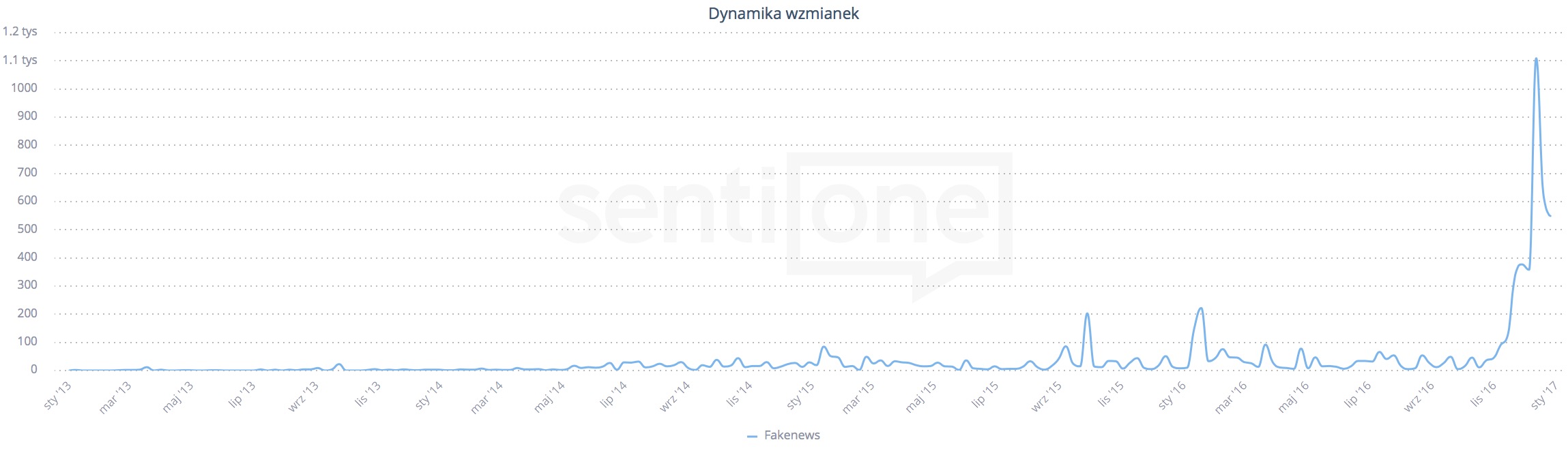 Dynamika wzmianek na temat “Fake news”. Źródło: SentiOne