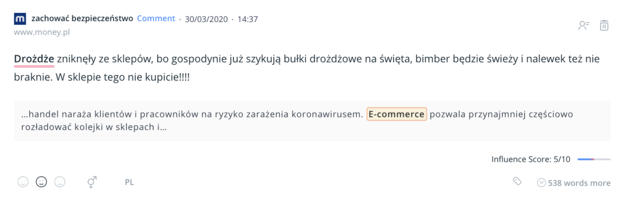 “Firmy e-commerce, kurierzy, paczkomaty i dostawcy posiłków to naturalni beneficjenci nowej sytuacji rynkowej. Działania tych marek skupiły się na zarządzaniu popytem, tj braki asortymentu, spóźnione dostawy, logistyką i wspieraniu poczucia bezpieczeństwa poprzez komunikację #zostańwdomu, Frisco skrupulatnie zarządzało sytuacją kryzysową związaną z terminami dostaw przez social media, o Allegro mówiło się w sieci 30% częściej, gdyż internauci poszukiwali na Allegro wszystkiego – również legendarnych drożdży. Glovo natomiast osiągnęło zasięgi na poziomie 47 milionów dzięki współpracy z Biedronką.” Agnieszka Uba, Product Marketing Manager SentiOne
