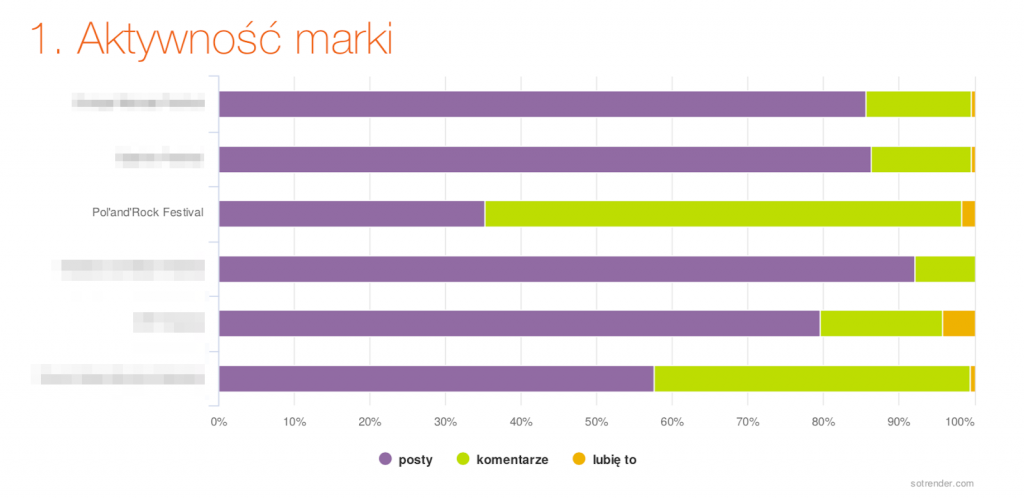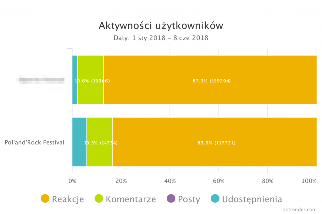 Naszą filozofię komunikacji najlepiej widać na wykresie pokazującym stosunek postów i komentarzy (a więc odpowiedzi na wiadomości użytkowników), a także to, jak wyglądamy w tym zakresie na tle innych polskich festiwali. Nie jesteśmy w stanie odpowiedzieć na każdą wiadomość i każdy komentarz, ale staramy się, ponieważ bardzo często pojawiają się w nich konkretne pytania.