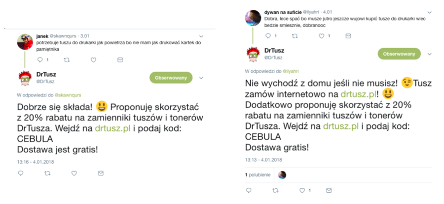 Przede wszystkim – konsekwentna strategia w budowaniu wizerunku i oryginalny brand hero, ustami (a raczej klawiaturą) którego dr Tusz do nas przemawia. Widać to szczególnie na Twitterze, na którym ustawiony ma monitoring internetu na wszystkie hasła związane z drukarkami, drukowaniem, tuszami i powiązanymi tematami, dzięki czemu zaskakuje potencjalnych klientów, budując świadomość marki w sposób jaskrawy, oryginalny i niezwykle pozytywny.