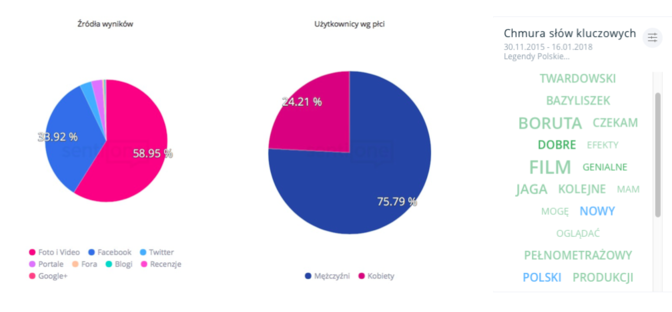 Źródła dyskusji, użytkownicy wg płci i wybrane słowa kluczowe dla tematu “Legendy Polskie. Allegro” od premiery pierwszego filmu.