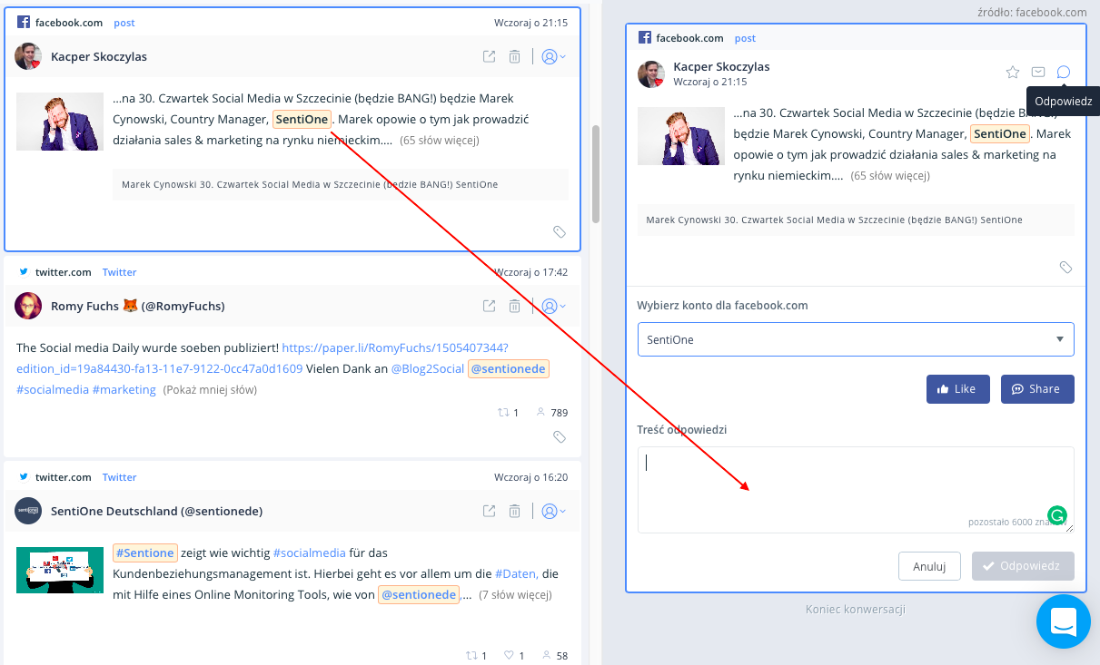 Do tego celu nieocenione okazują się narzędzia do monitoringu internetu – aby śledzić dyskusje internautów o marce nawet w tych źródłach, w których nie jest obecna lub nie została oznaczona przez piszącego. To jednak nadal za mało – sprawne odpowiadanie na nie, jak widać powyżej również jest dziś koniecznością. Aby to sobie ułatwić, warto korzystać nie tylko z naszej podstawowej oferty, ale też odpowiadać w wielu źródłach z poziomu jednego narzędzia – taka funkcja dostępna jest np. w module SentiOne React.