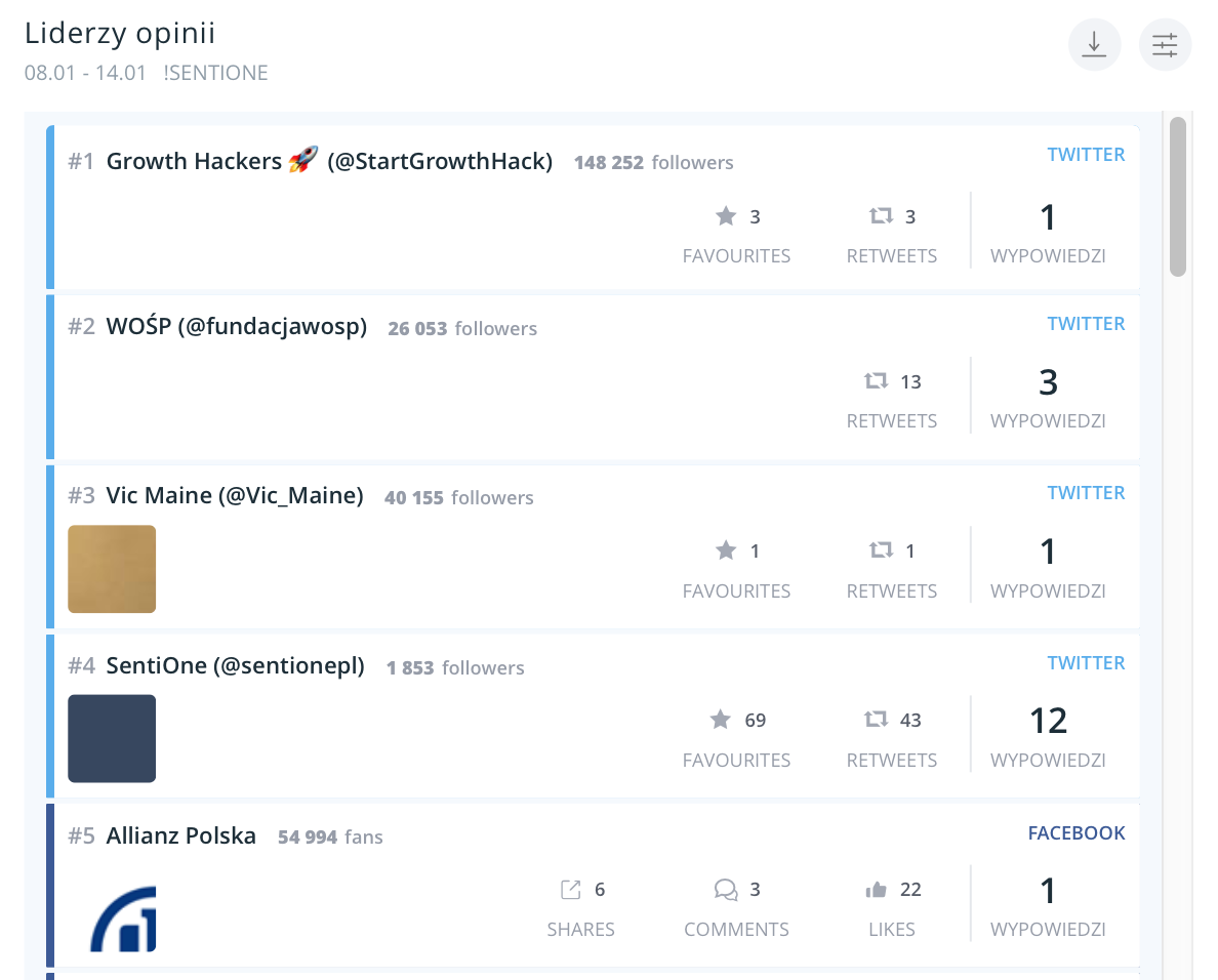 #5 poznać najpopularniejsze wzmianki (na podstawie zasięgu) i ich autorów (liderów opinii), którzy angażują potencjalnych konsumentów