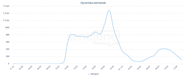 Dynamika wzmianek na temat “Maspex” w dniach 9-10 sierpnia 2017 r. Źródło: SentiOne