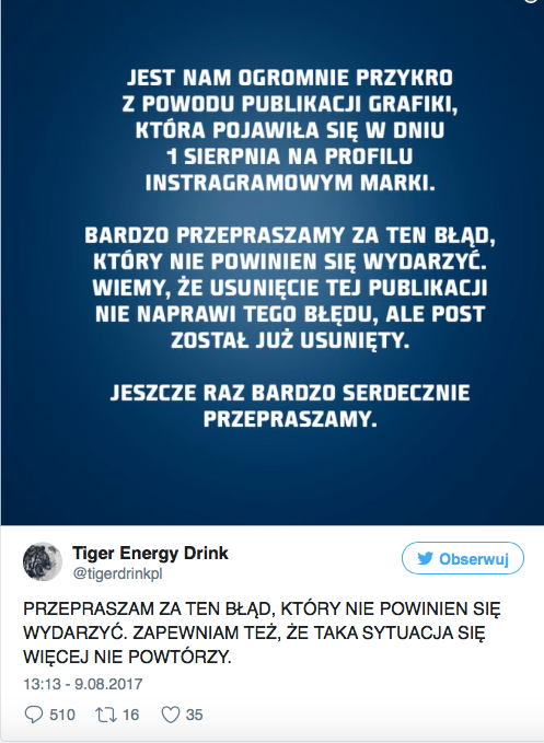 Trzeba przyznać, że przedstawiciele marki zareagowali bardzo szybko, już około 13.00 publikując na Facebooku i Twitterze przeprosiny. Nie była to jednak reakcja udana – przede wszystkim, w takim przypadku wyrażenie skruchy to zdecydowanie za mało – po drugie, nie nauczona doświadczeniem marka nadal starała się pozostać w konwencji NIEPOKORNEGO, CAPSLOCKOWEGO TYGRYSA: