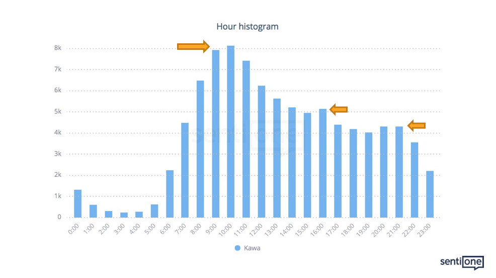 Przykład? Poniższy wykres prezentuje godziny, w których najczęściej internauci wypowiadają się na temat kawy. Oznacza to, że prowadząc bloga kawiarni, możemy postować właśnie w tym czasie, kiedy zainteresowanie kawą jest największe. To jednak rozwiązanie dość oczywiste, a przecież w sieci ogranicza nas jedynie kreatywność. Do kawy idealnie pasują przecież słodycze, a każdy dietetyk powie, że po filiżance kawy należy odpowiednio się nawodnić…