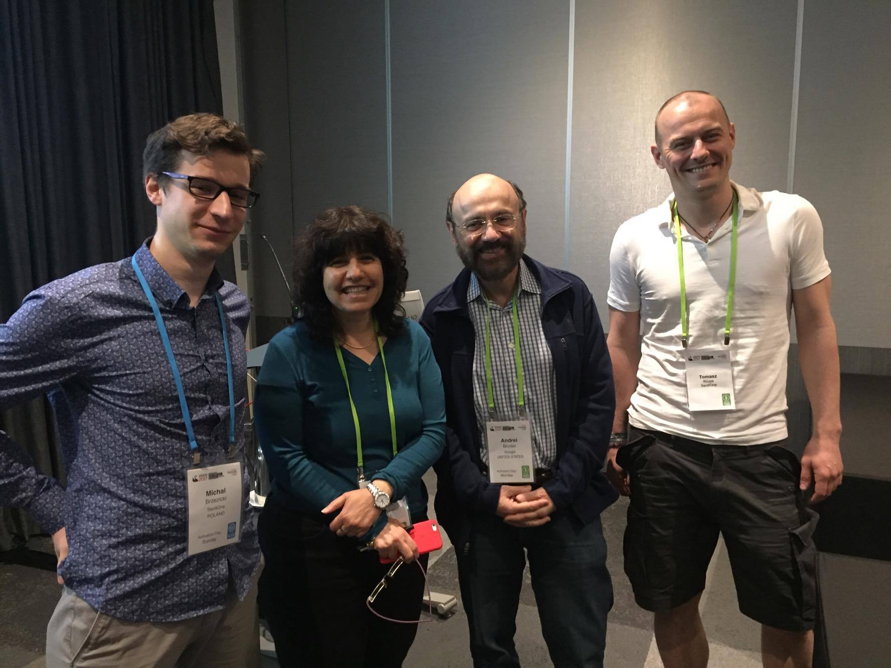 Na zdjęciu dumnie prezentują się: Michał Brzezicki – CTO w SentiOne, Tomek Krupa – Head of Research w SentiOne oraz Yoelle Maarek – VP of Research w Yahoo! i Andrei Broder – web search guru z Google