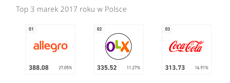 Na przestrzeni całego 2017 roku, konkurencję zdystansowało Allegro. Zaraz za gigantem z branży e-commerce kolejny – OLX. Na podium nie mogło zabraknąć Coca-Coli, która w miesięcznych zestawieniach wygrała zarówno w listopadzie, jak i grudniu ubiegłego roku.