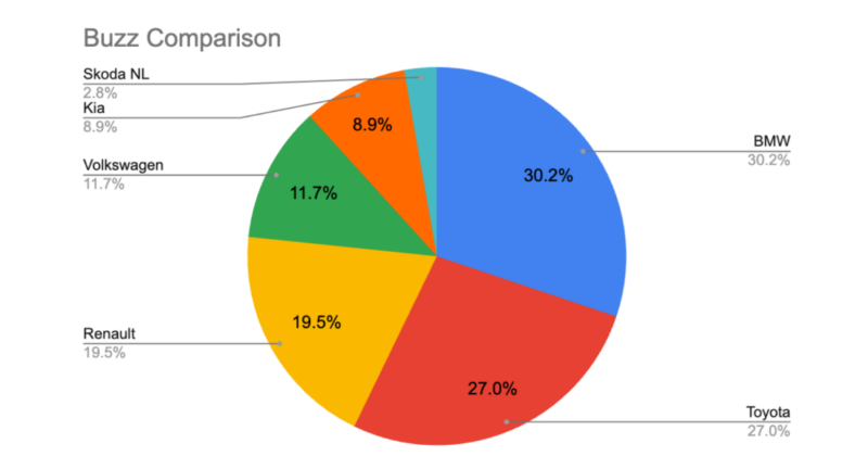 If buzz were everything, BMW and Toyota would be clear winners. They dominate the share of voice, sparking more than half of all online conversations in the segment.