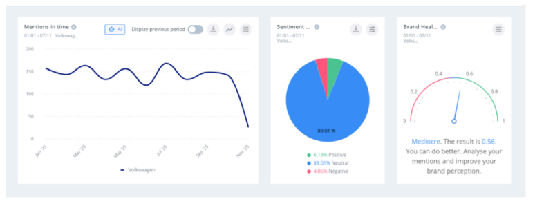 VW’s reach is vast, but sentiment remains volatile — a reminder that even legacy brands must constantly steer the conversation.
