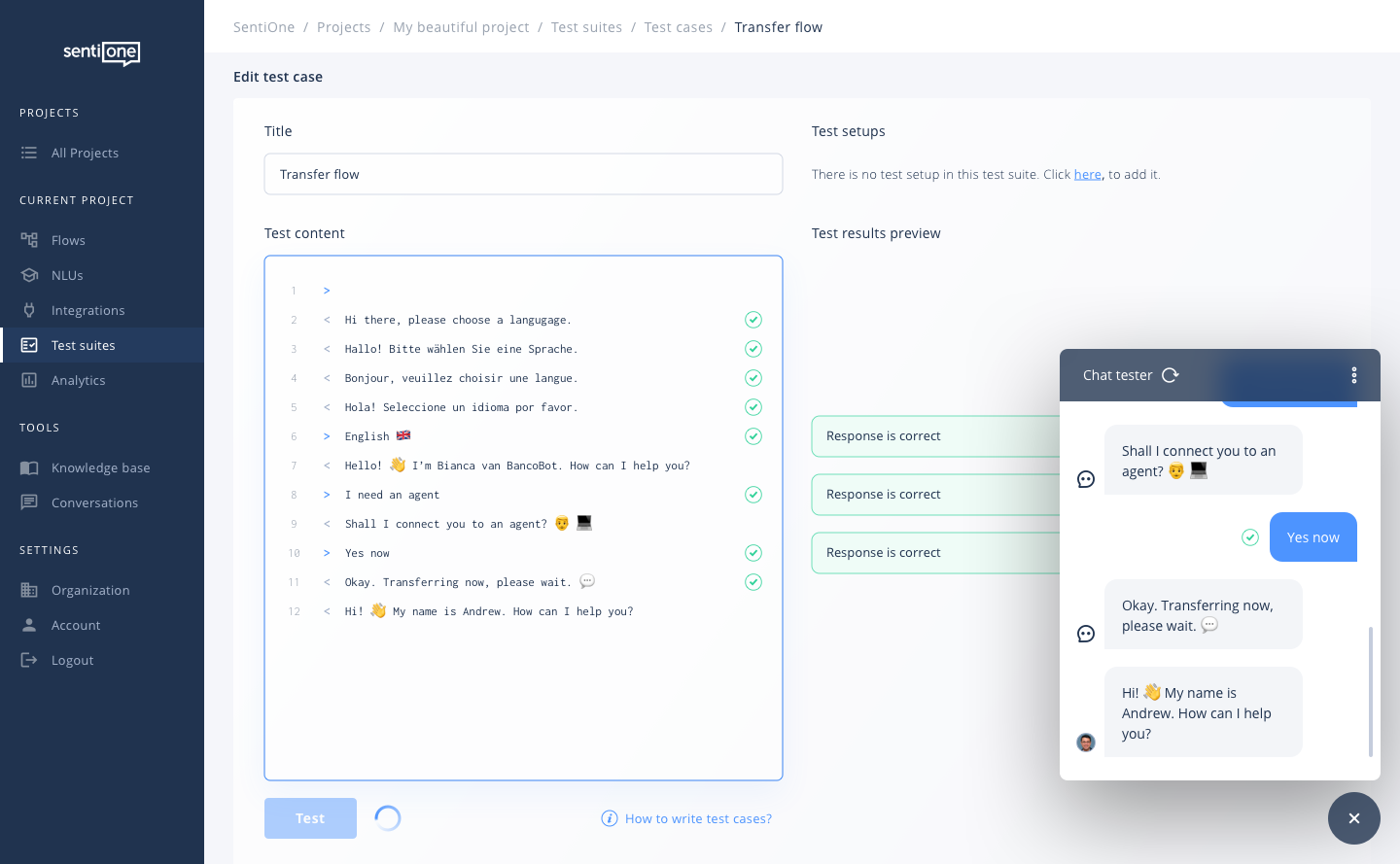 Przetestuj każdą funkcję bota. Integracje zewnętrzne, tagi do analityki, polecenia, zawartość bazy wiedzy... Co tylko wymyślisz! Używaj istniejących rozmów aby szybko projektować nowe testy – bez potrzeby pisania scenariuszy od zera.